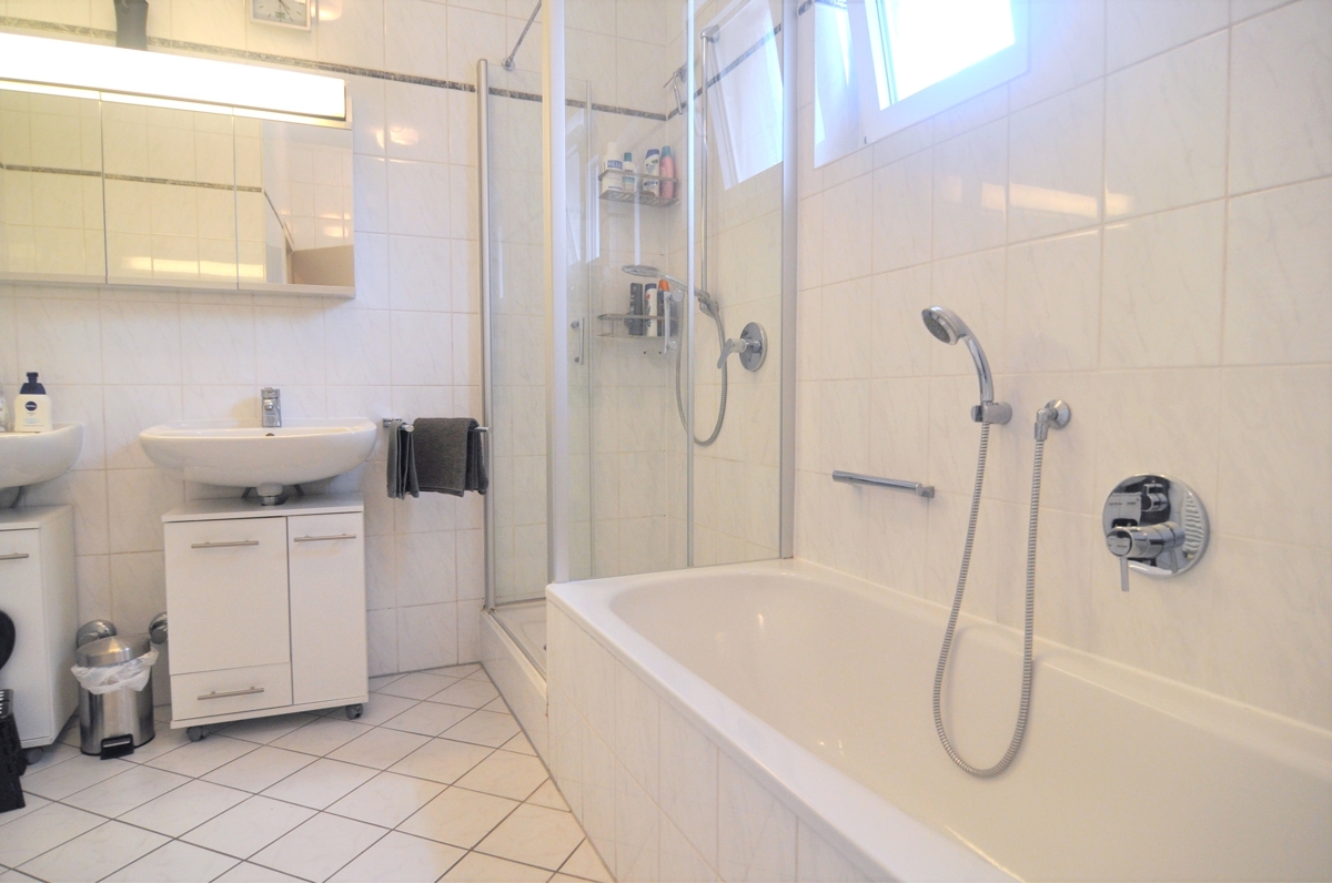 - Helles TL-Bad mit Wanne, Dusche, zwei Waschbecken