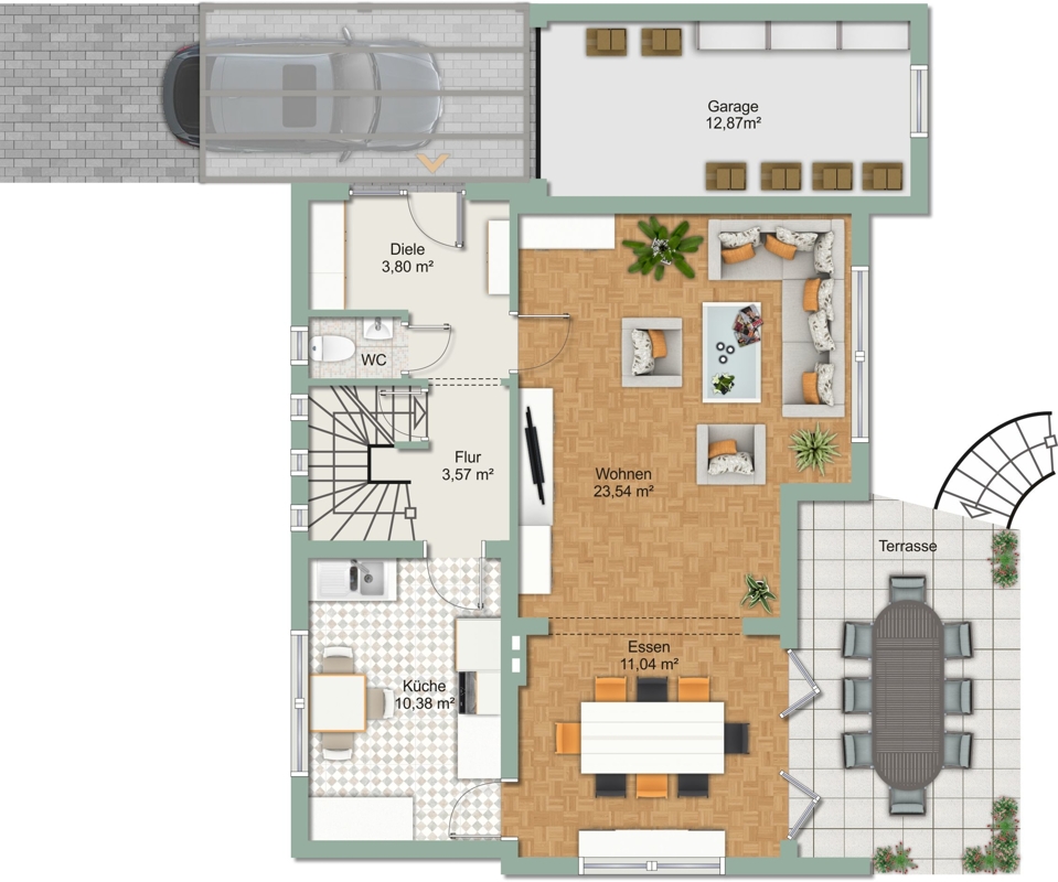 - Vor dem Wohnraum befindet sich eine Terrasse mit Treppe