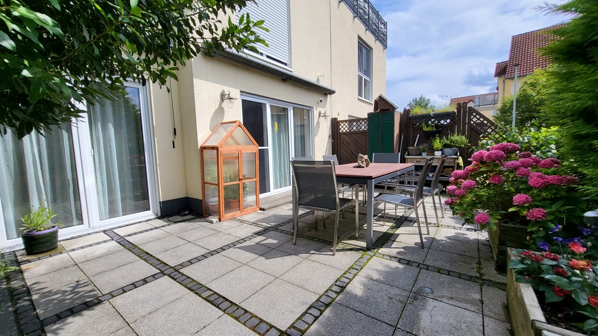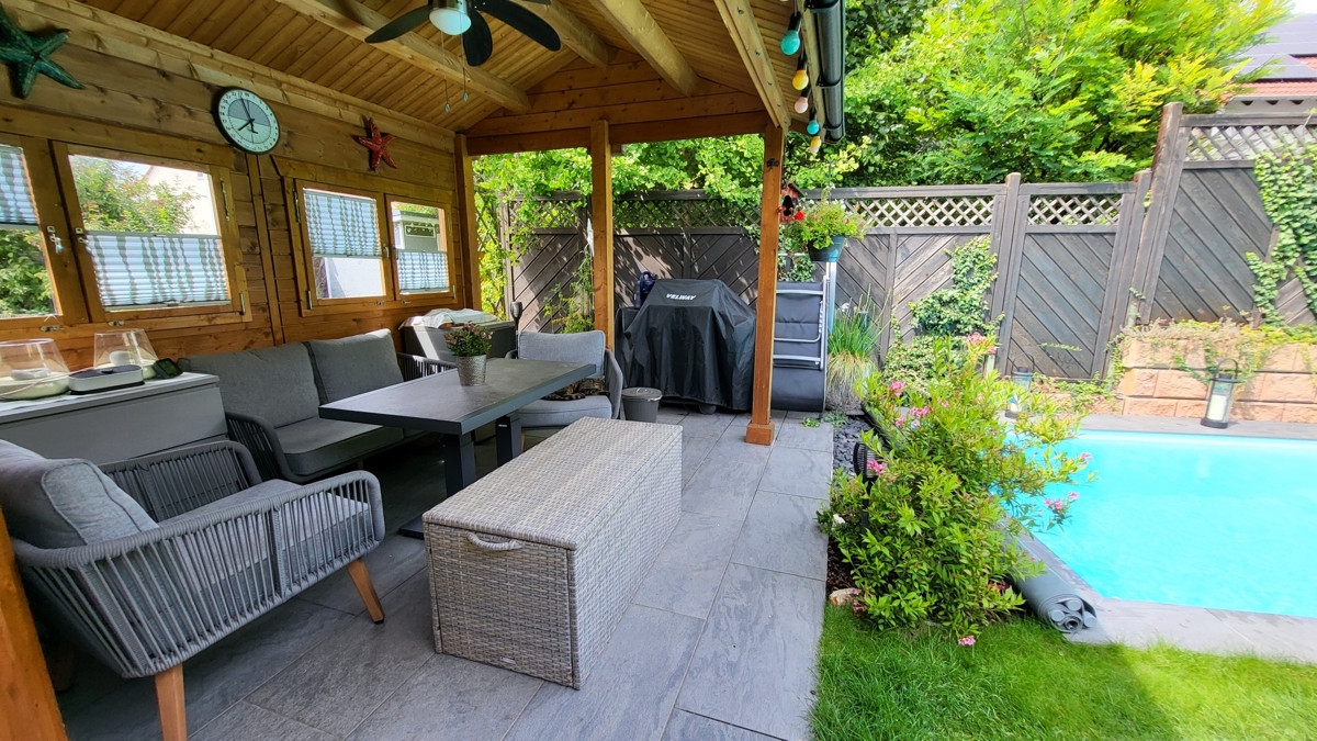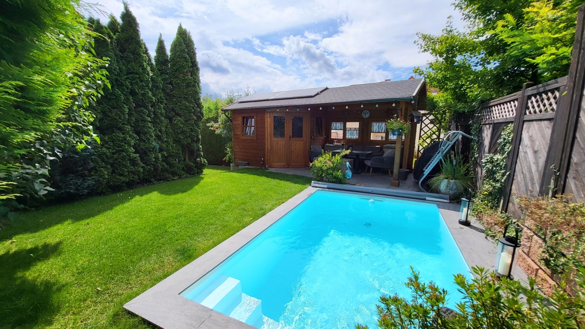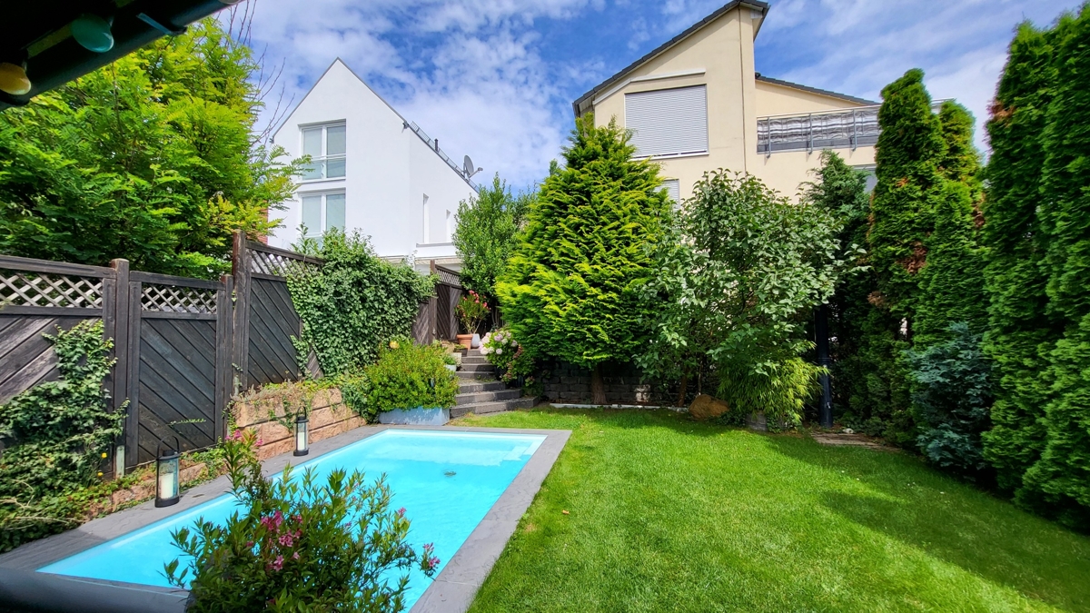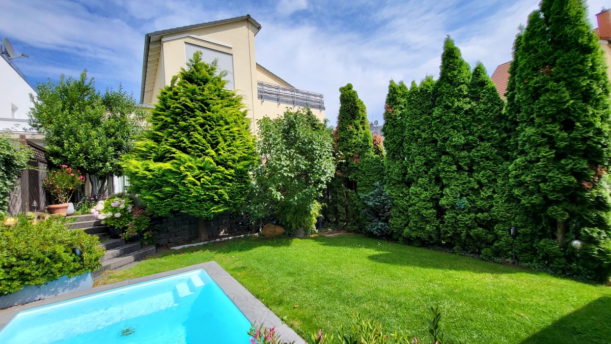 Im nach Südwesten ausgerichteten Garten finden Sie eine große, über die komplette Hausbreite gehende Terrasse mit Markise sowie den im hinteren Teil des Grundstückes gelegenen beheizten Pool. Ergänzt wird der Garten noch durch das massive Gartenhaus. Das Haus steht in einem ruhig gelegenen gewachsenen Wohngebiet.