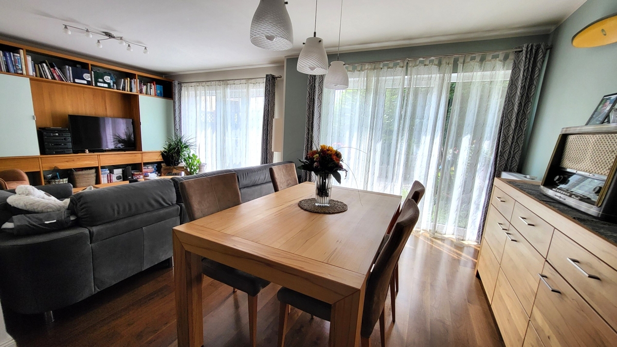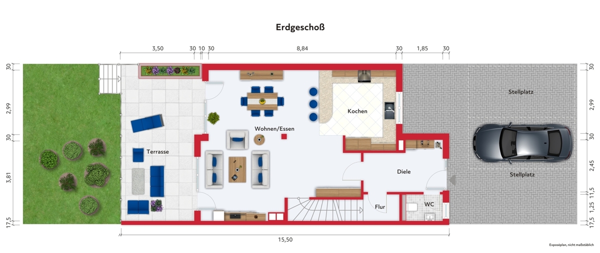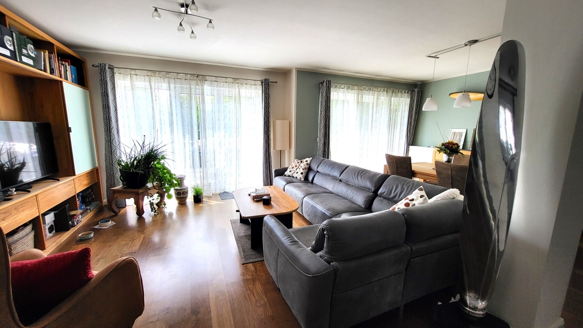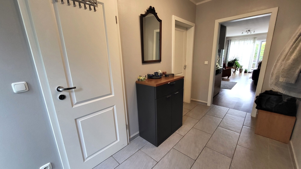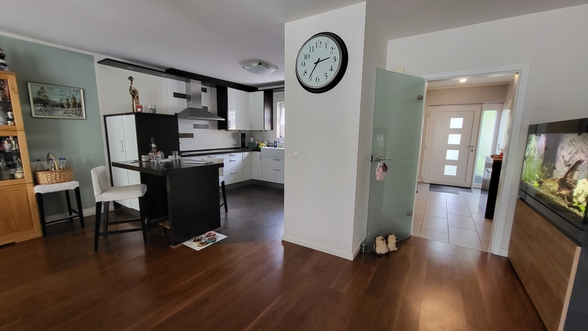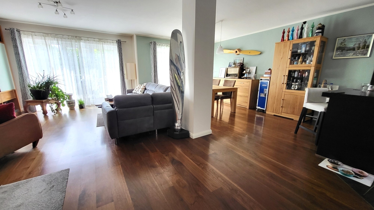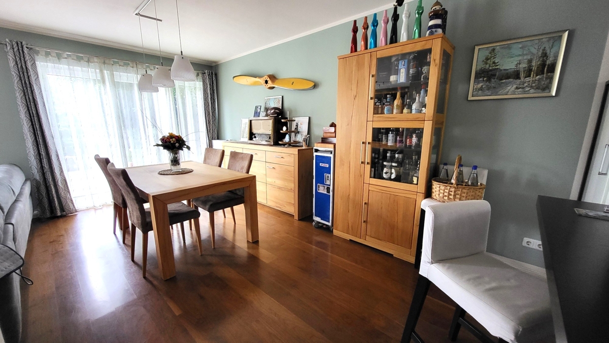 Hinter der Eingangstüre erwartet Sie die großzügige Diele mit Garderobenbereich und Zugang zum Gäste-WC. Von hier aus gelangen Sie in den insgesamt gut 55 m² großen Wohn-/ Essbereich mit offener, komplett ausgestatteter Küche. Dieser ist mit einem Parkettboden ausgelegt, die Küche mit modernen Fliesen. Ergänzt wird die großzügige Fläche im EG um eine Sonnenterrasse mit Südwest Ausrichtung.