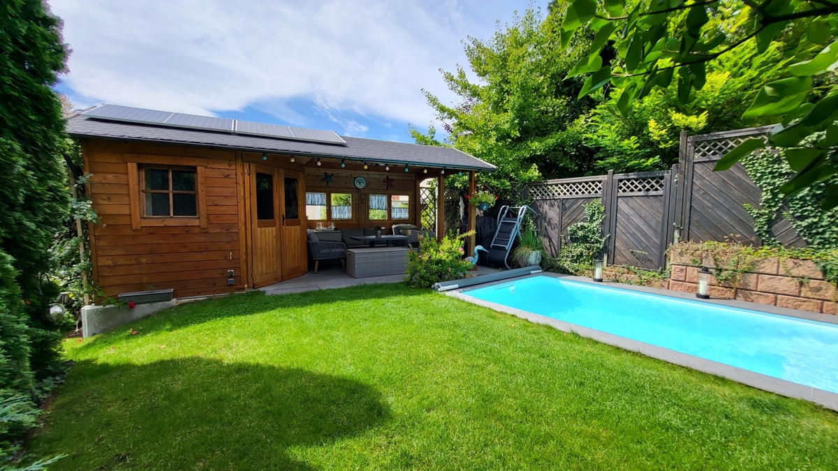 - Großes Gartenhaus mit Innen- und überdachtem Außenbereich Strom autark mit „Inselkraftwerk“ und Stromspeicher.
