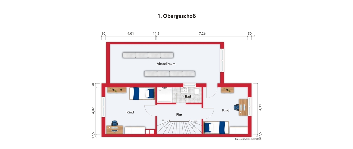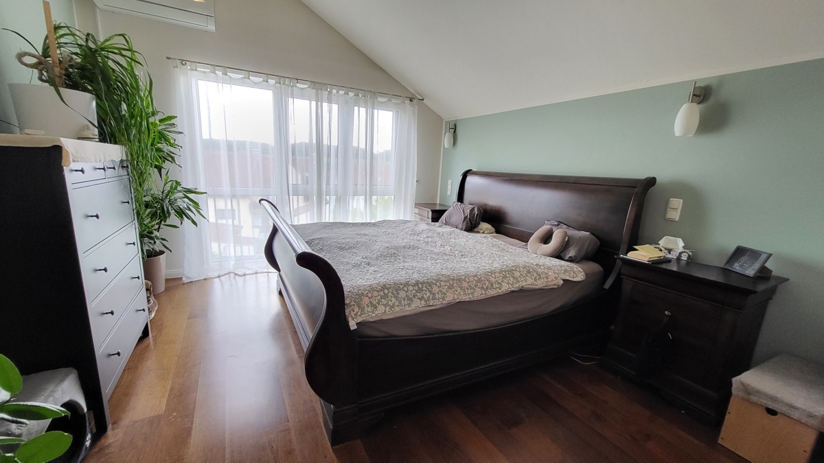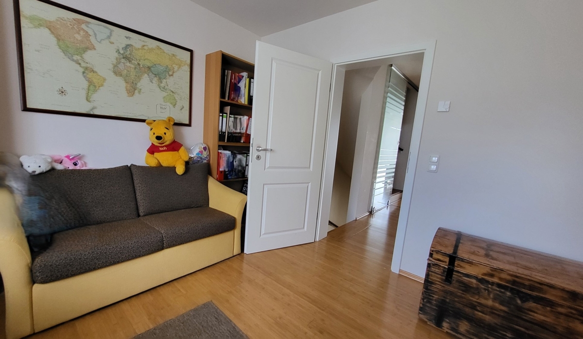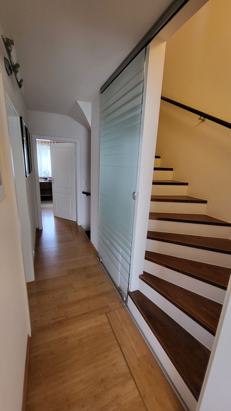 Über die massive Innentreppe gelangen Sie in das 1. OG, dass 2 Schlafzimmer mit Parkettböden und ein modernes Dusch-Bad mit Tageslichtfenster bietet. Angrenzend befindet sich ein riesiger Abstellraum mit verminderter Stehhöhe.