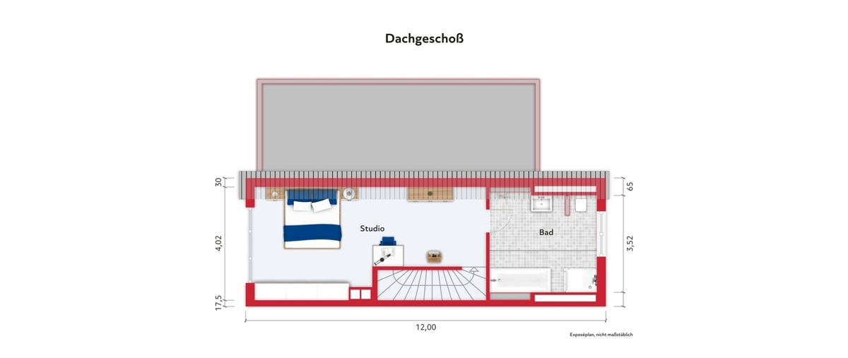 Im Dachgeschoss erwartet Sie ein großes, ca. 30 m² großes Studio mit großem Südwest Panorama-Fenster. Direkt angrenzend befindet sich das ca. 13 m2 umfassende Master-Bad mit großer Badewanne und Dusche auf einer kleinen Empore sowie moderner Waschtischanlage und Toilette.