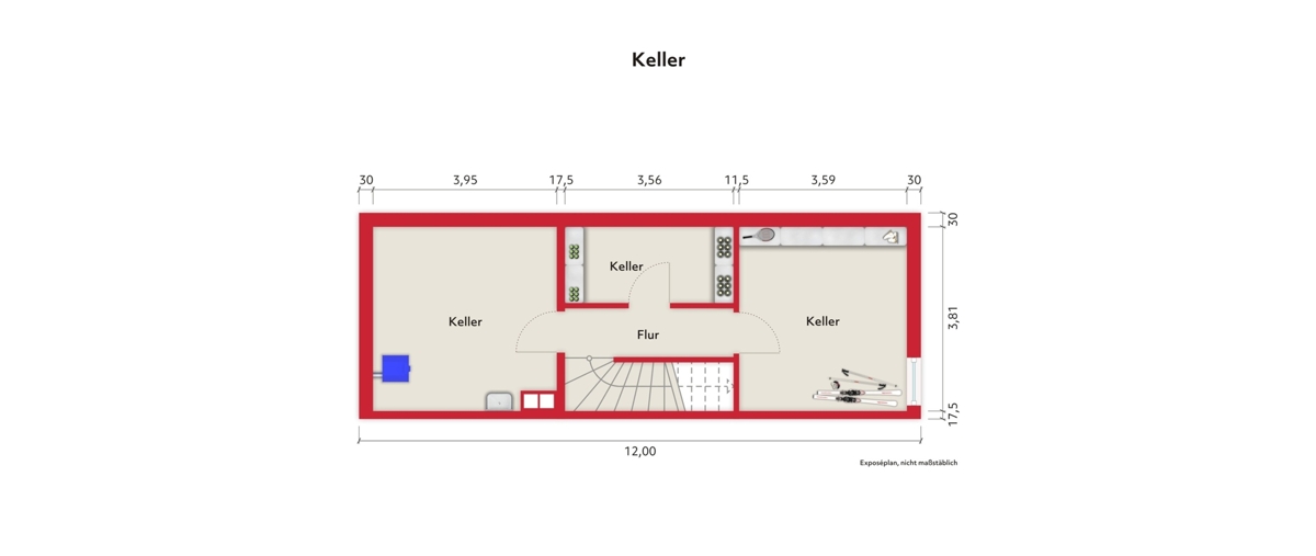 Im Kellergeschoss befinden sich der Waschkeller mit Hobbywerkstatt und zwei weitere ca. 14 m² und 6 m² große Kellerräume. Alle Kellerräume sind gefliest.