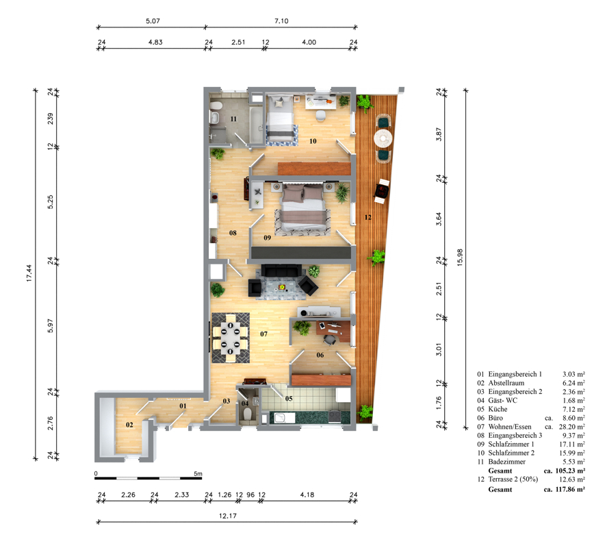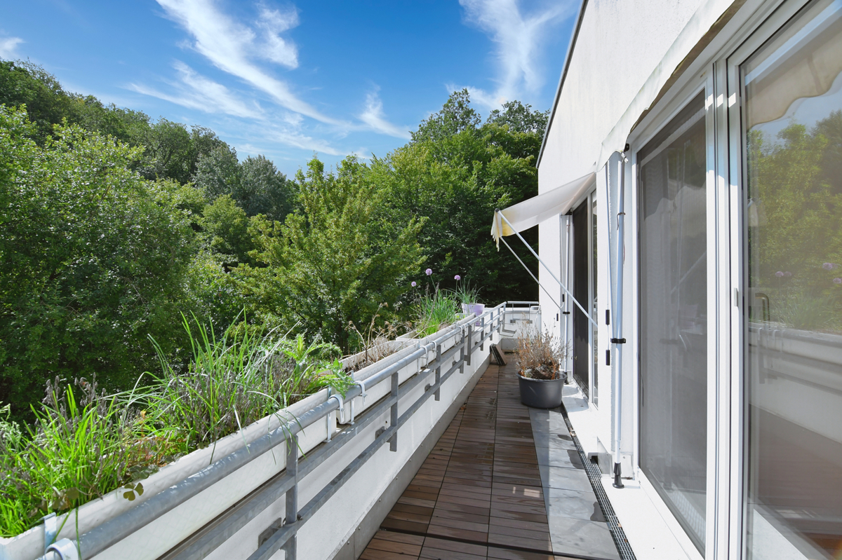 Entdecken Sie diese traumhafte Terrassenwohnung, die ideal für Tierhalter ist und direkt am Wald liegt. Der eigene Eingang beschert Ihnen zusätzliche Privatsphäre. Mit zwei Schlafzimmern und einem Büro bietet diese Immobilie höchsten Wohnkomfort. Der großzügige Wohnbereich sowie ein Schlafraum sind klimatisiert. Die Räume öffnen sich zur herrlichen Terrasse, die einen atemberaubenden Blick ins Grüne bietet und sich über die gesamte Breite der Wohnung erstreckt. Das Badezimmer ist mit Tageslicht, einer Badewanne und Platz für die Waschmaschine ausgestattet, ergänzt durch ein Gäste-WC. In der Wohnung befindet sich ein Abstellraum und zwei Stellplätze in der Tiefgarage sorgen für gute Parkmöglichkeiten.